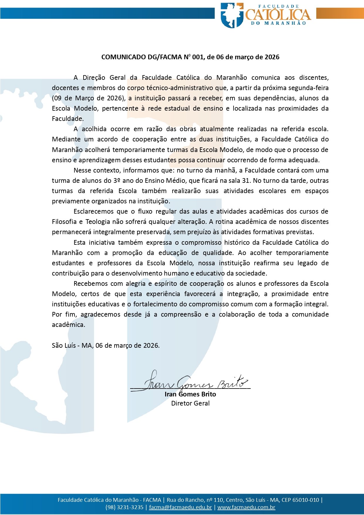 A Direção Geral da Faculdade Católica do Maranhão comunica aos discentes, docentes e membros do corpo técnico-administrativo que, a partir da próxima segunda-feira (09 de Março de 2026), a instituição passará a receber, em suas dependências, alunos da Escola Modelo, pertencente à rede estadual de ensino e localizada nas proximidades da Faculdade.